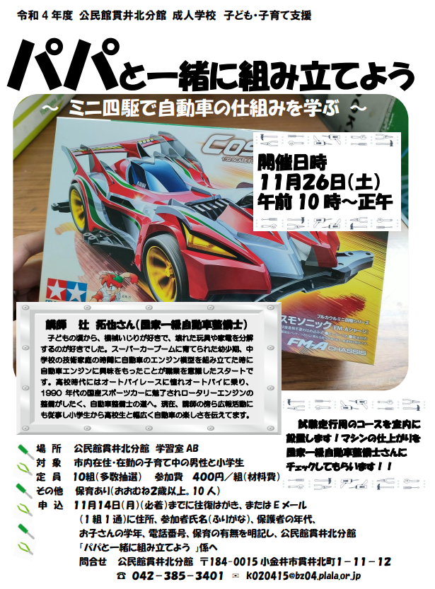 国家一級自動車整備士の辻拓也さんから教えていただく「パパと一緒に組み立てよう~ミニ四駆で自動車の仕組みを学ぶ~」です。