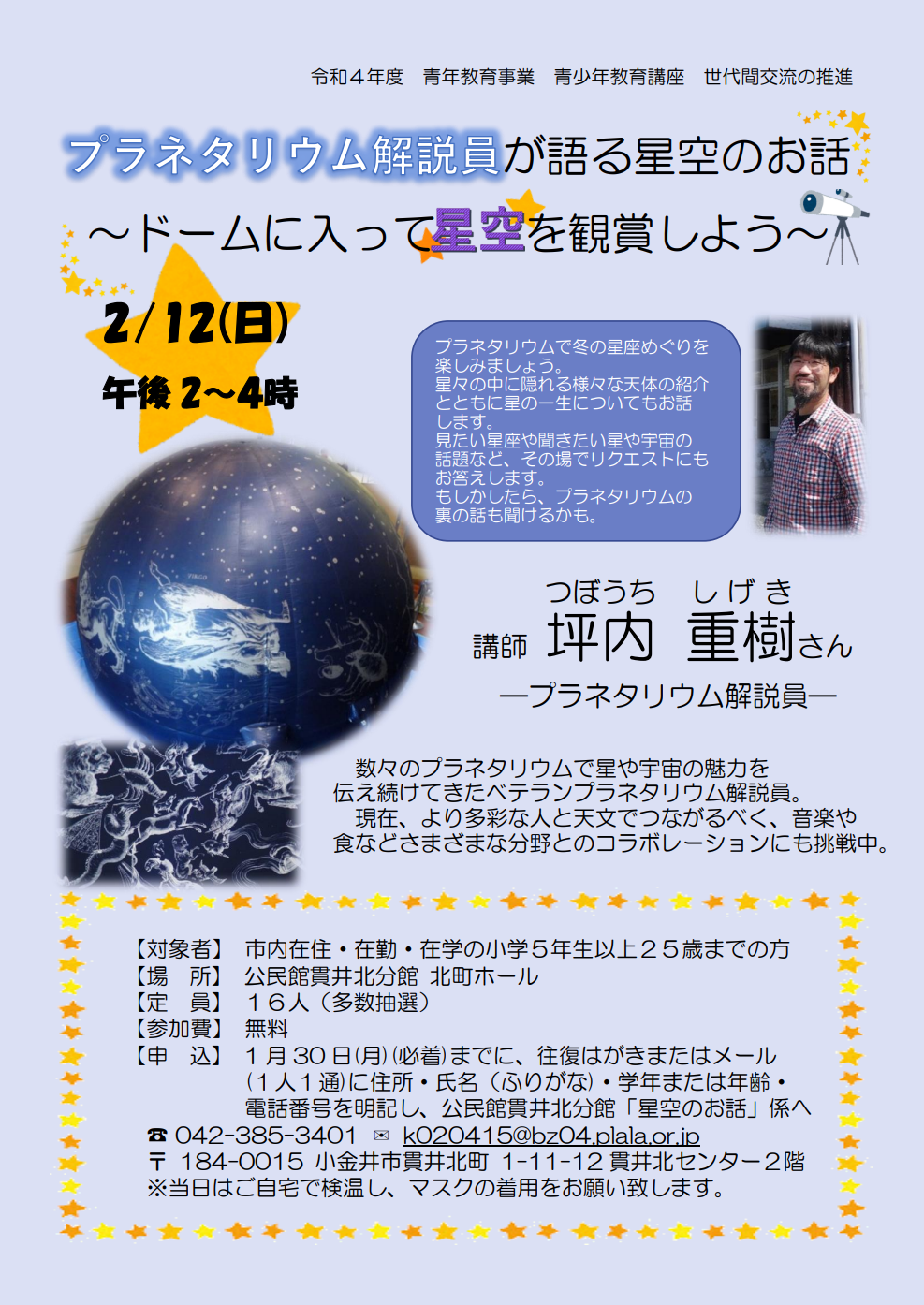 2月12日(日)青少年教育講座 世代間交流の推進「プラネタリウム解説員が語る星空のお話~ドームに入って星空を観察しよう~」開催します。