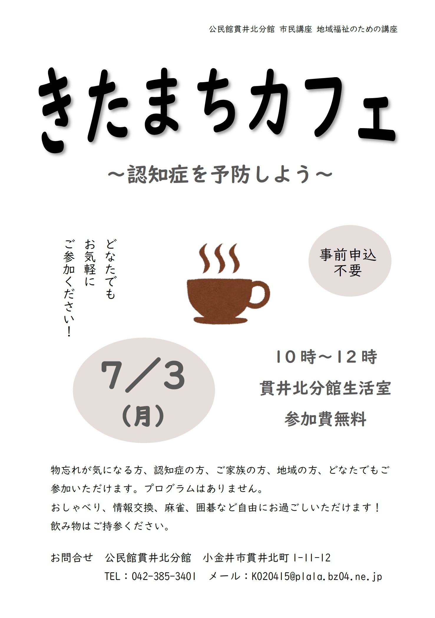 7/3(月)10~12時「きたまちカフェ~認知症を予防しよう~」開催いたします。
