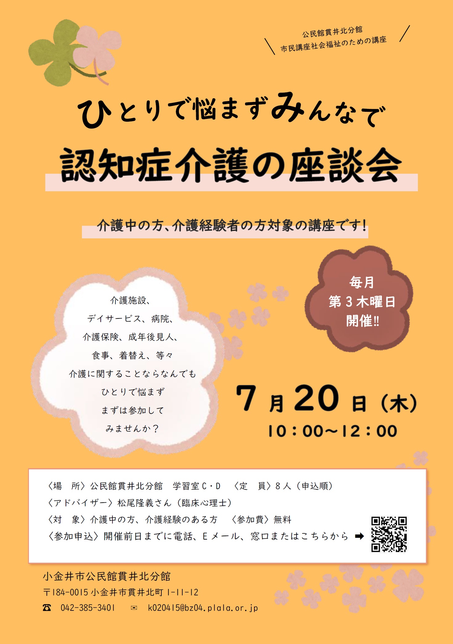 7/20(木)10~12時「ひとりで悩まずみんなで認知症介護の座談会」開催いたします。