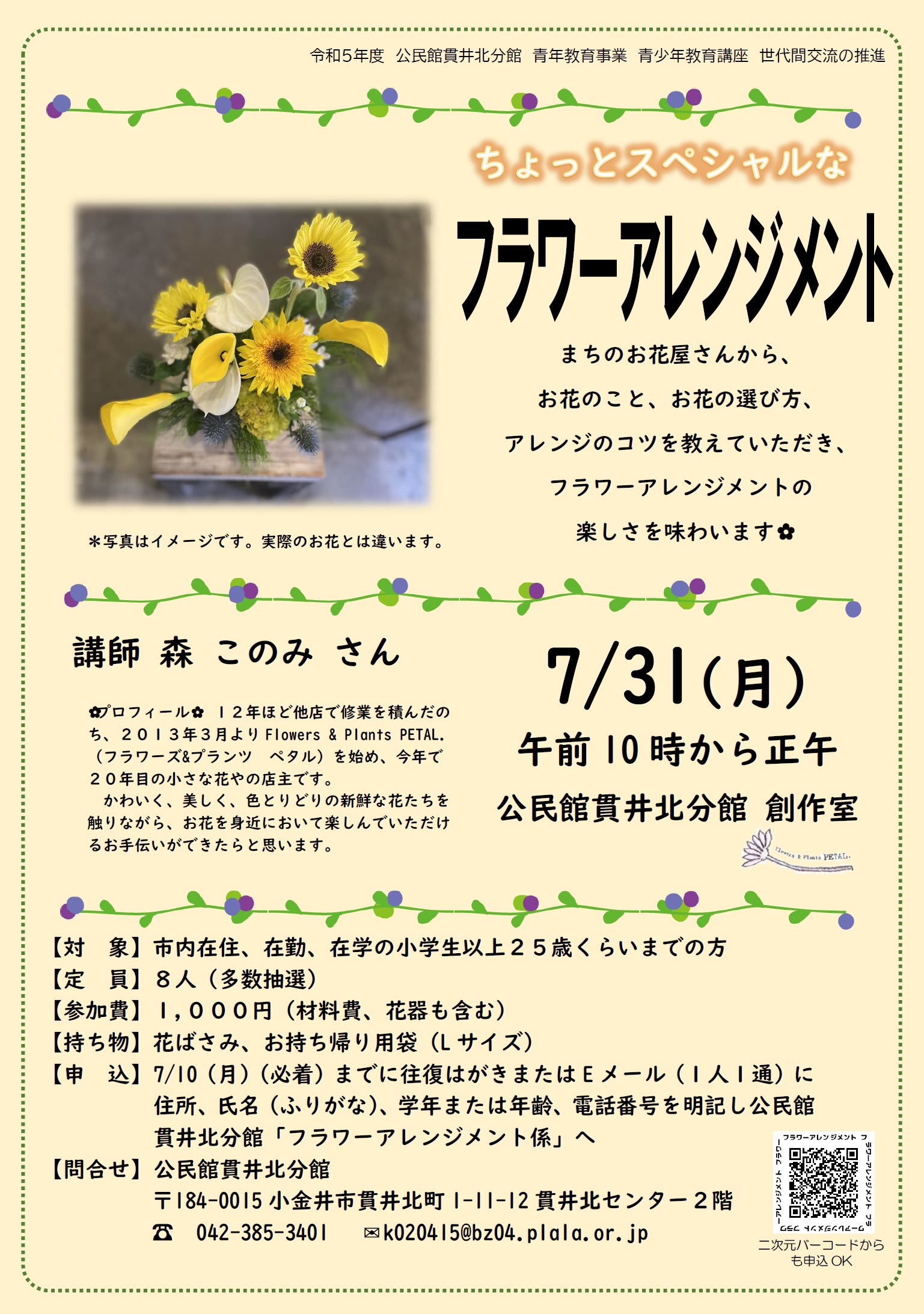 夏休みにいかがですか?対象は小学生以上25歳くらいまでの方。学校や学年、世代を超えた空間で、学び合います。講師は、地元小金井のお花屋さん 森 このみさんです。