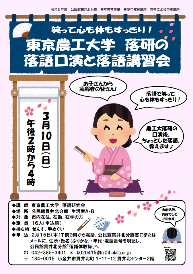 3/10(日) 若者による自主講座「笑って心も体もすっきり!東京農工大学 落研の落語口演と落語講習会」開催いたします。