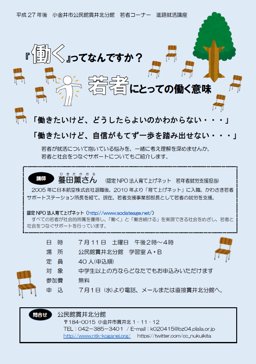 | NPO法人 市民の図書館・公民館こがねい | 電話:042-385-3401 FAX :042-385-3402 E-MAIL: info☆ntk-koganei.org |
