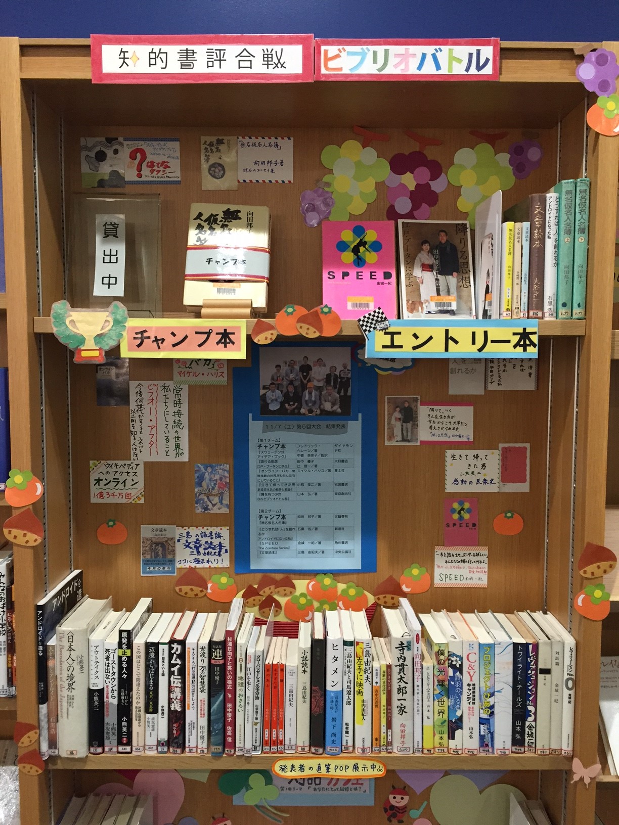 平成27年11月7日(日)、第5回ビブリオバトル大会を開催いたしました。発表された本、関連本をバトラーの皆さまのPOPを付け、企画コーナーを設けて展示しています。どうぞお手に取ってご覧ください。
