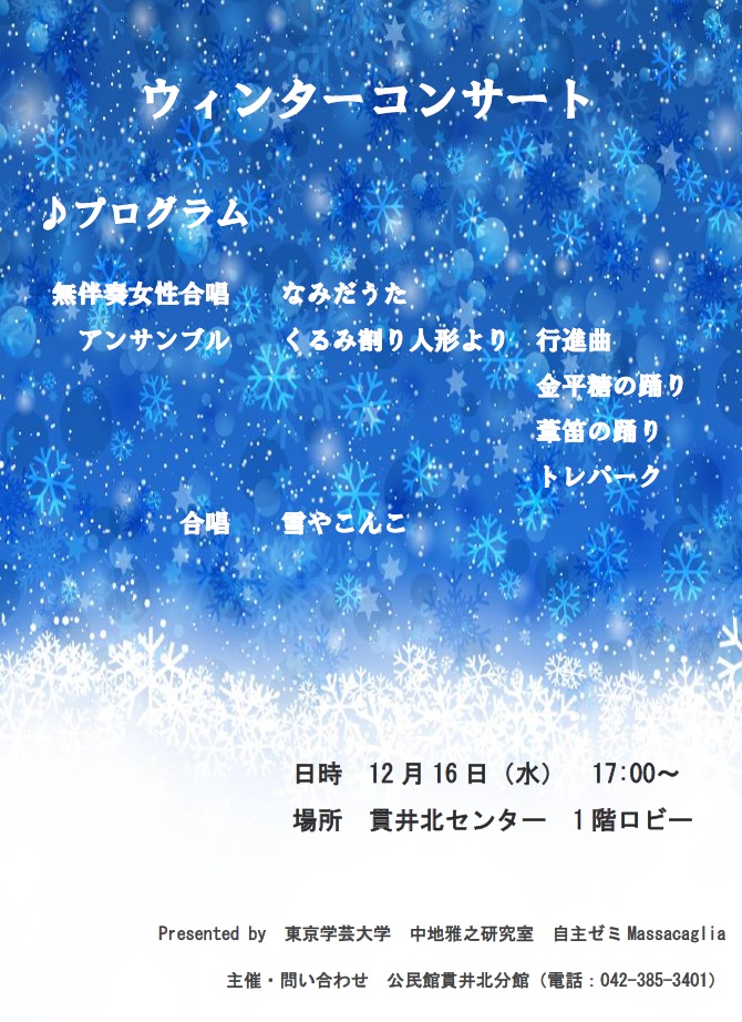 ウィンターコンサート開催します!東京学芸大生によるトーンチャイムや合唱です。12月16日(水)17時から 1階ロービー。直接会場にお越しください。