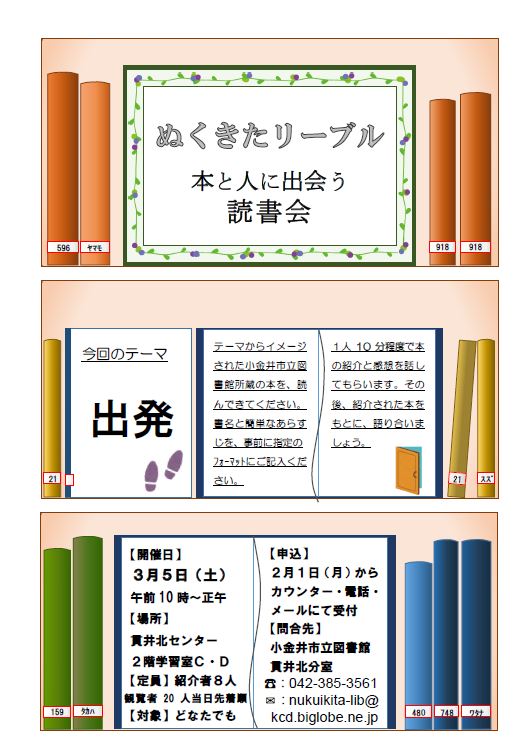 【申 込】 2月1日(月)午前9時から、直接または☎、メール(nukuikita-lib@kcd.biglobe.ne.jp)でどうぞ。