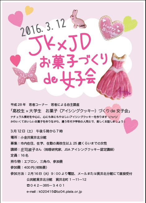 若者による自主講座「高校生×大学生 お菓子(アイシングクッキー)づくりde女子会」 募集を締め切らせていただきました。お申込みありがとうございました。