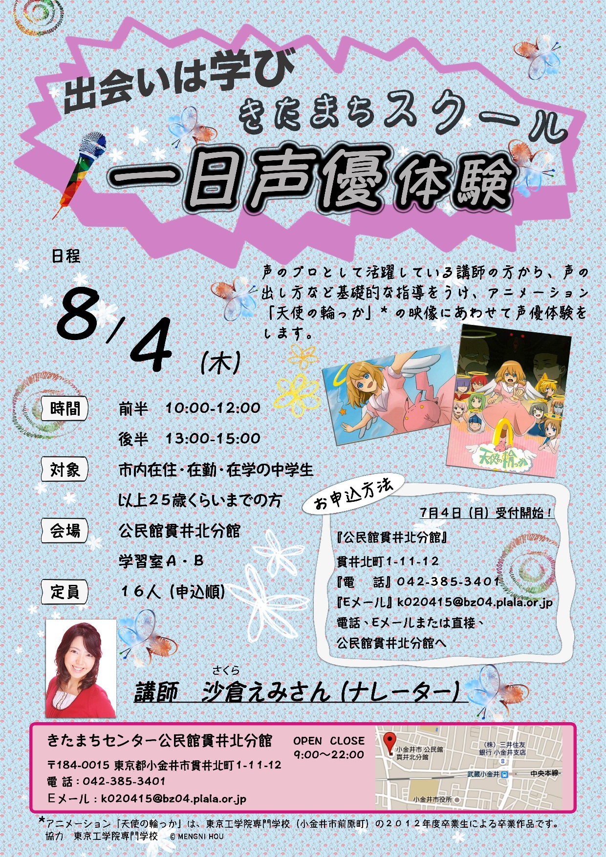 【申 込】 7月4日(月)から電話、Eメールまたは直接公民館貫井北分館まで
