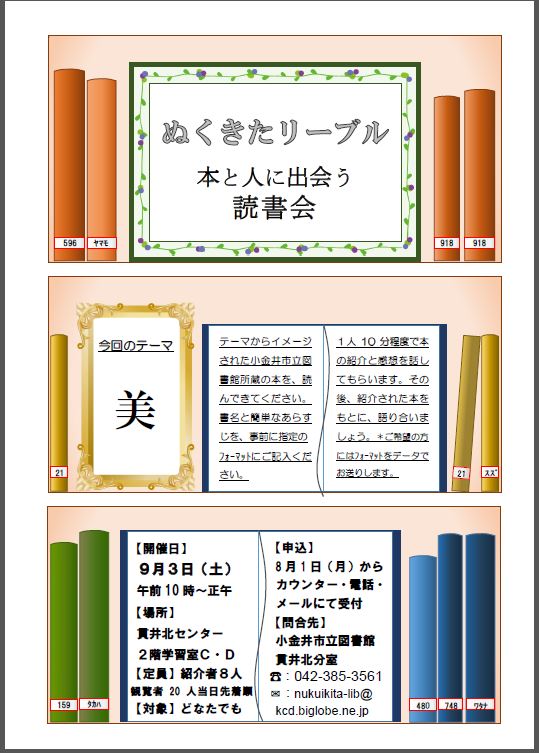 ※このイベントは終了しました 9/3(土)「第7回ぬくきたリーブル(図書館読書会)」を開催します。