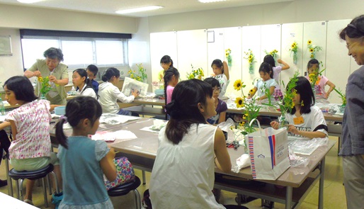 小金井市文化連盟の茶道部会員と華道部会員の方々を講師に招き、小学生から25歳くらいまでの方々に "和" を体験していただきました。午前中は、着物姿の講師ご指導のもと、茶道に必要な立派な道具が生活室に持ち込まれ、本格的な "茶室の空間" での講座になりました。午後は、創作室で、ご持参いただいたペットボトルをアレンジして器を作成し、夏にふさわしいお花の生け方を学びました。各グループに分け、ちょっと学年が上のお姉さんたちが、器作りで苦労している仲間を見てお手伝いしている様子、仕上がった作品を嬉しそうに、そのお姉さんに見せている様子を見ていると、公民館での講座の意義を改めて感じました。仕上がった作品を並べると、創作室が素適な"花畑の空間"になりました。教えていただいた講師の皆さま、一日講座に参加していだたいた皆さま、誠にありがとうございました。