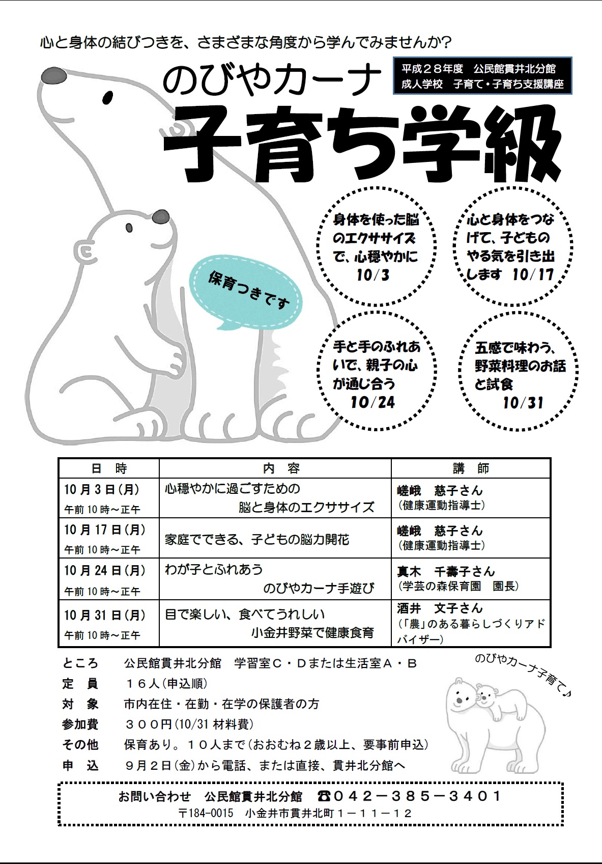 子育て・子育ち支援講座「のびやカーナ子育ち学級」の参加者、9月2日(金)からお申込み受付いたします。心と身体の結びつきを、さまざまな角度から学んでみませんか?保育(10人まで。おおむね2歳以上、要事前申込)つき講座です。