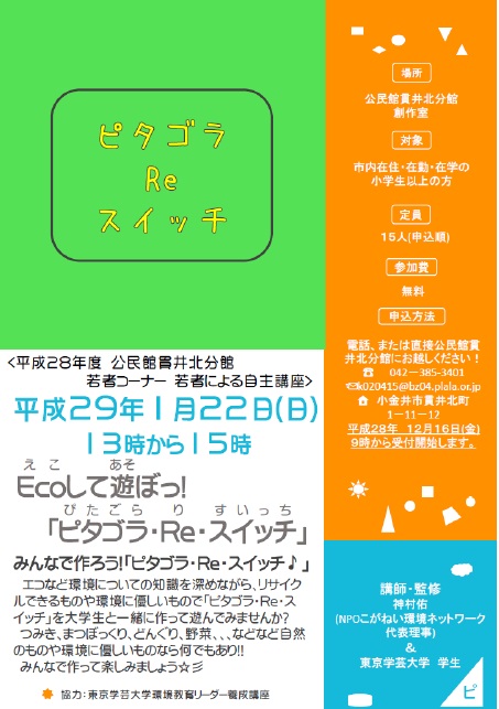 若者による自主講座「Ecoして遊ぼっ!ピタゴラ・Re・スイッチ」」 定員に達しましたので、募集を締め切らせていただきました。お申込みいただき、誠にありがとうございました。