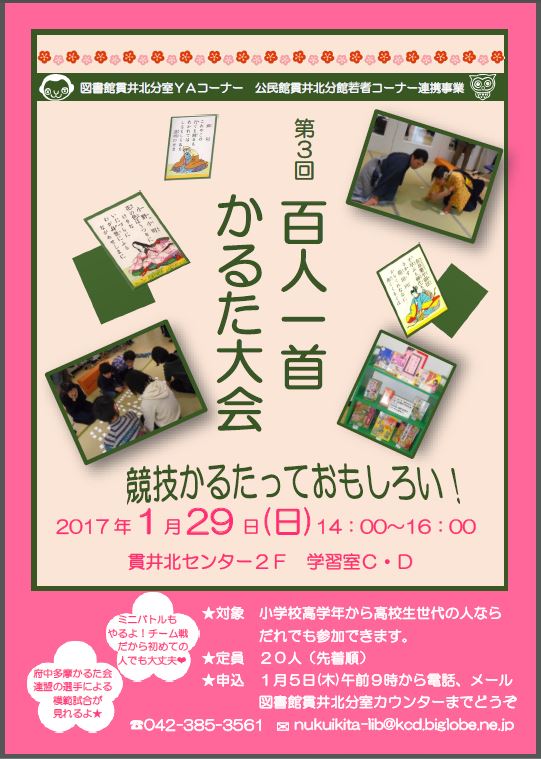 【申込先】 1月5日(木)から図書館貫井北分室 窓口、電話(042-385-3561) メール(nukuikita-lib@kcd.biglobe.ne.jp)でどうぞ。