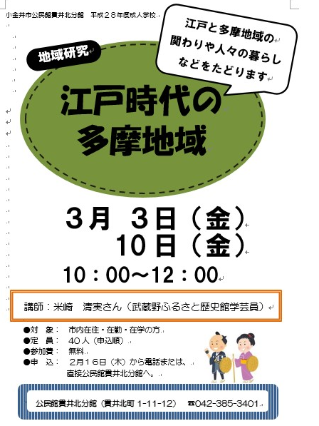 成人学校 地域研究「江戸時代の多摩地域」 受付を締め切らせていただきました。お申込みいただき誠にありがとうございました。