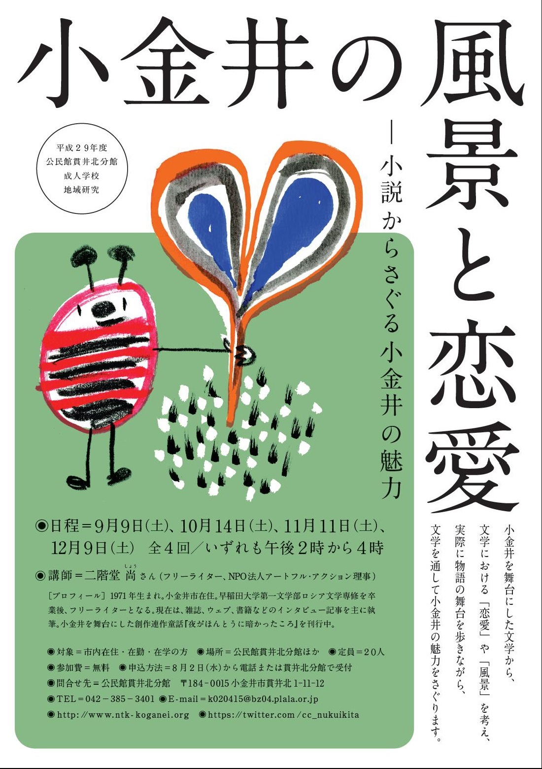 小金井を舞台とした文学から、文学における「恋愛」や「風景」を考え、実際に物語の舞台を歩きながら、文学を通して小金井の魅力をさぐります。 【講 師】 二階堂 尚様(フリーライター、NPO法人アートフル・アクション理事)【対 象】 市内在住・在勤・在学の方【場 所】 公民館貫井北分館ほか【定 員】 20人【参加費】 無料【申込方法】 電話、または貫井北分館で受付【問合せ先】 公民館貫井北分館 〒184-0015 小金井市貫井北1‐11‐12 ☎ 042-385-3401 ✉ k020415@bz04.plala.or.jp