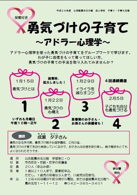 成人学校 子育て・子育ち支援 「勇気づけの子育て ~アドラー心理学~」 受付を締め切らせていただきました。お申込みいただき、誠にありがとうございました。