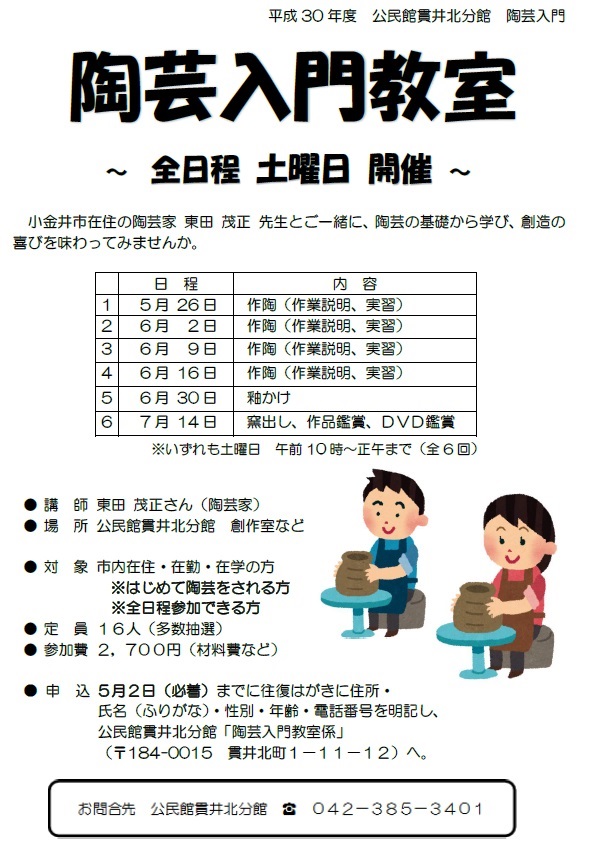 平成30年度「陶芸入門教室」 参加者お申込み締め切らせていただきました。