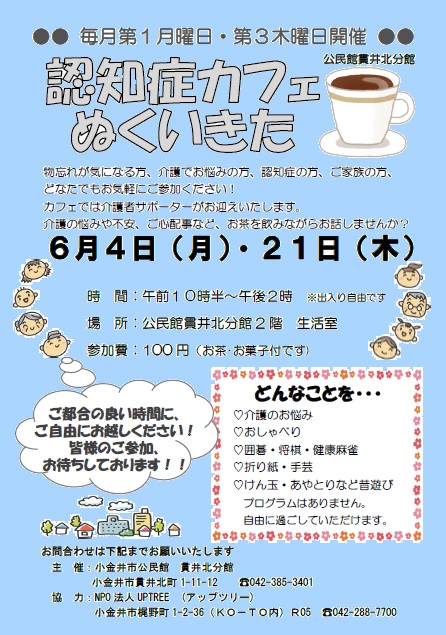 「認知症カフェぬくいきた」6月4日(月)、21日(木)開催のご案内
