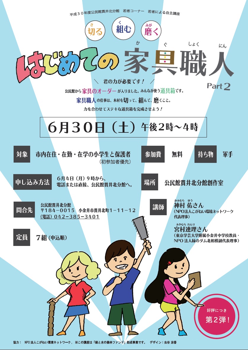 若者による自主講座「はじめての家具職人2 ~切る・組む・磨く~」 お申込みを締め切らせていただきました。お申込みいただきました皆さま、誠にありがとうございました。