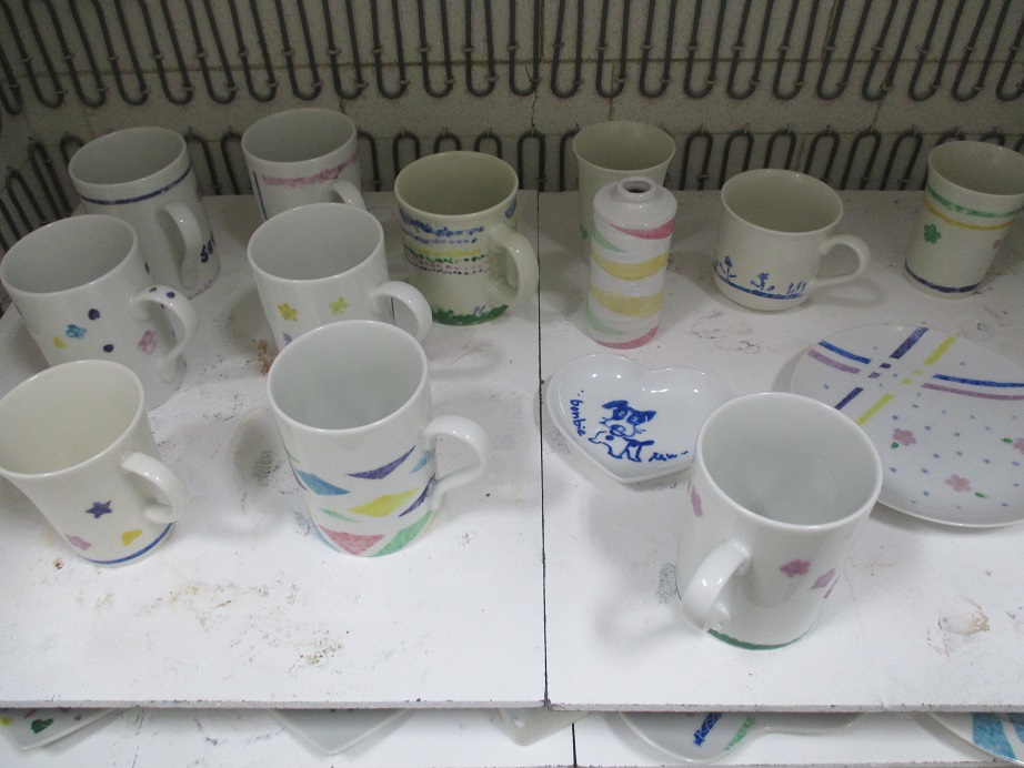今回の会場は創作室。ボタルニカアーティストの先生を招いて参加者の皆さん、カップやお皿に思い思いの絵付けをしました。とてもきれいな作品が創作室に広がりました。焼き上がりがとても楽しみです!