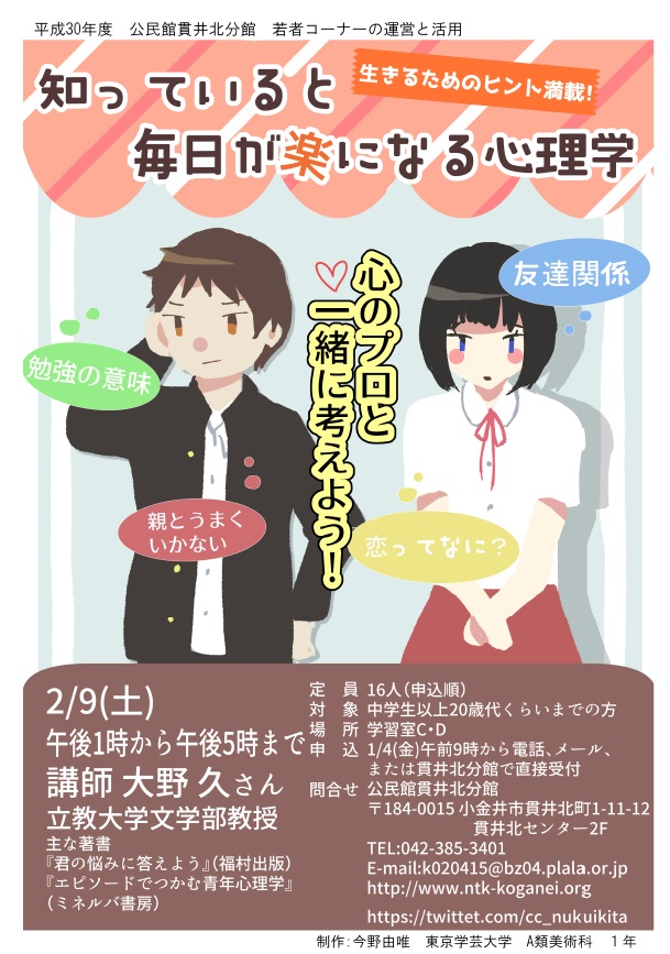 「知っていると毎日が楽になる心理学」(2月9日開催)、1月4日(金)午前9時から受付致します。