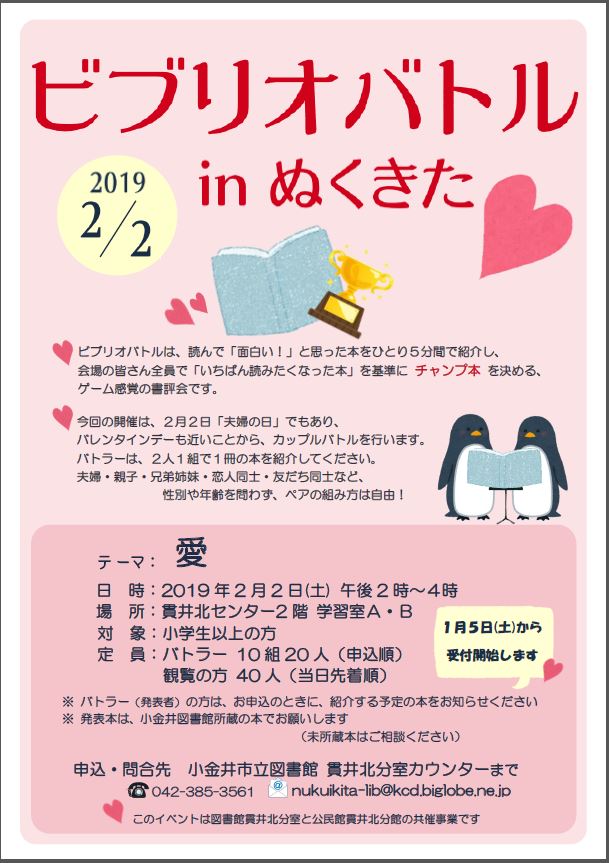 【問合・申込先】 1/5日(土)から、図書館貫井北分室へ窓口・電話(042-385-3561)または、