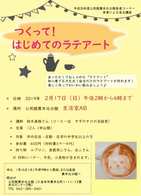若者による自主講座「つくって!はじめてのラテアート」 定員となりました。キャンセル待ちを受付中です。