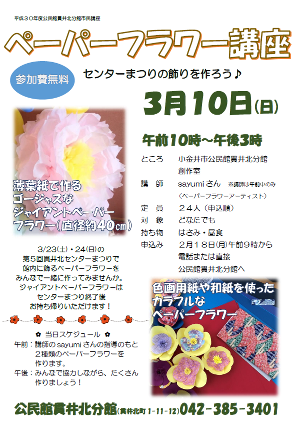 ペーパーフラワーアーティストのsayumiさんを講師に招いて、第5回貫井北センターまつりで館内を飾る、2種類のペーパーフラワーを、参加者の皆さんと一緒に作りませんか。薄葉紙で作っていただいた作品は、センターまつり終了後、お持ち帰りいただけます! ☎042-385-3401