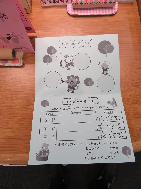 スタンプカードとチューリップ型などの感想や絵を書く用紙をお配りしています。