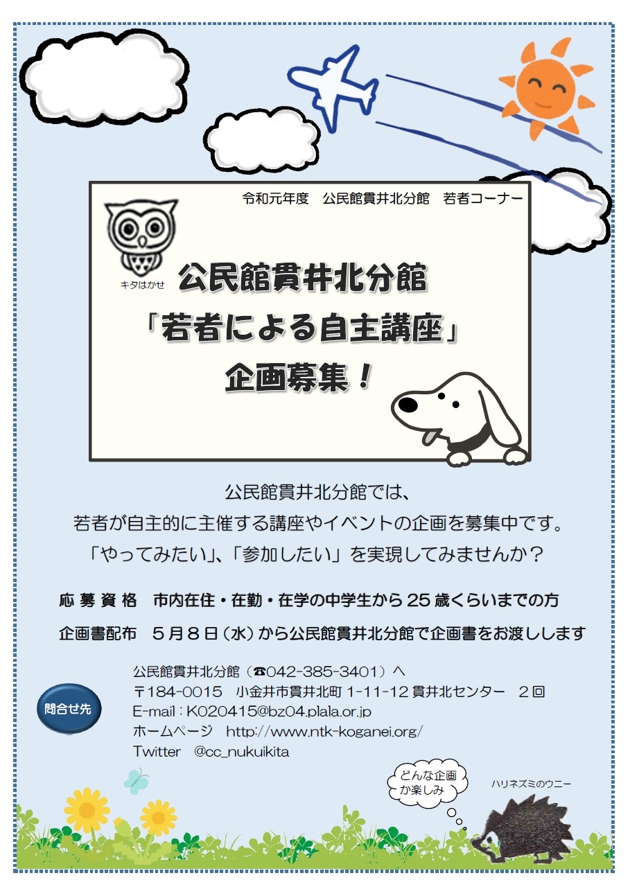 公民館貫井北分館では、若者が自主的に主催する講座やイベントの企画を募集しています。「やってみたい」、「参加したい」を一緒に実現しませんか?