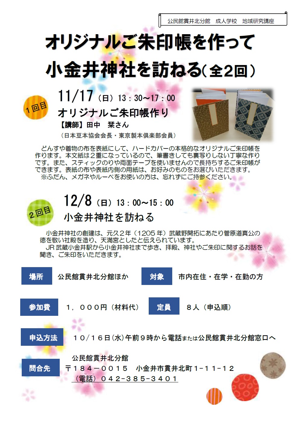 成人学校 地域研究「オリジナルご朱印帳を作って小金井神社を訪ねる」定員となりました。お申込みありがとうございました。