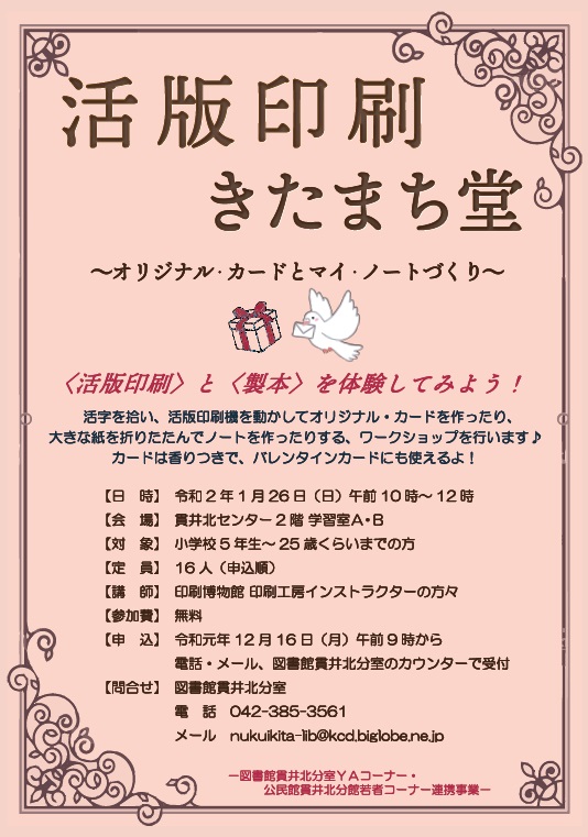 【申 込】12月16(月)午前9時から図書館貫井北分室で受付開始 窓口・電話(042-385-3561)またはメール nukuikita-lib@kcd.biglobe.ne.jp でどうぞ