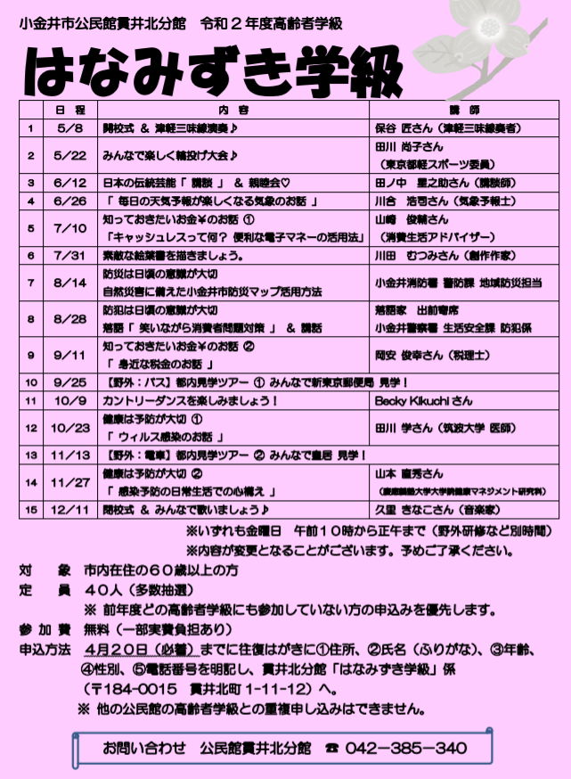 高齢者学級「はなみずき学級」お申込み締め切らせていただきました。