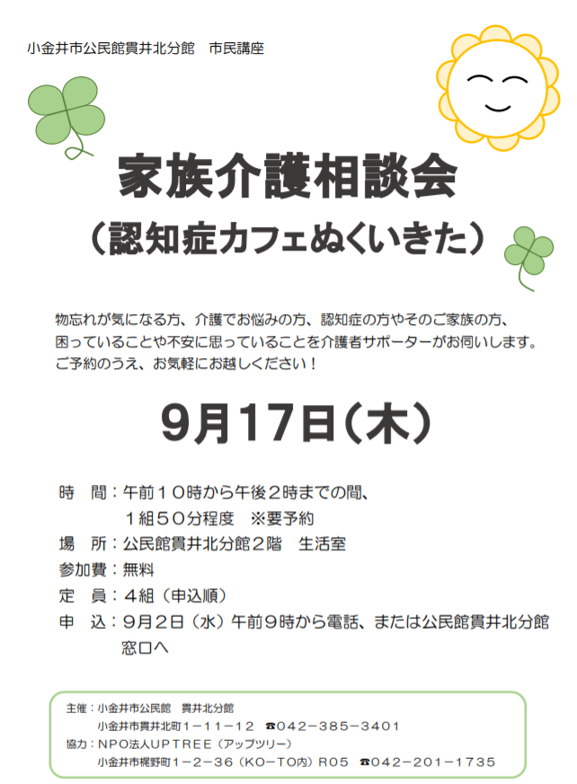 市民講座「家族介護相談会(認知症カフェぬくいきた)」のお申し込みを9月2日(水)午前9時から受付いたします。