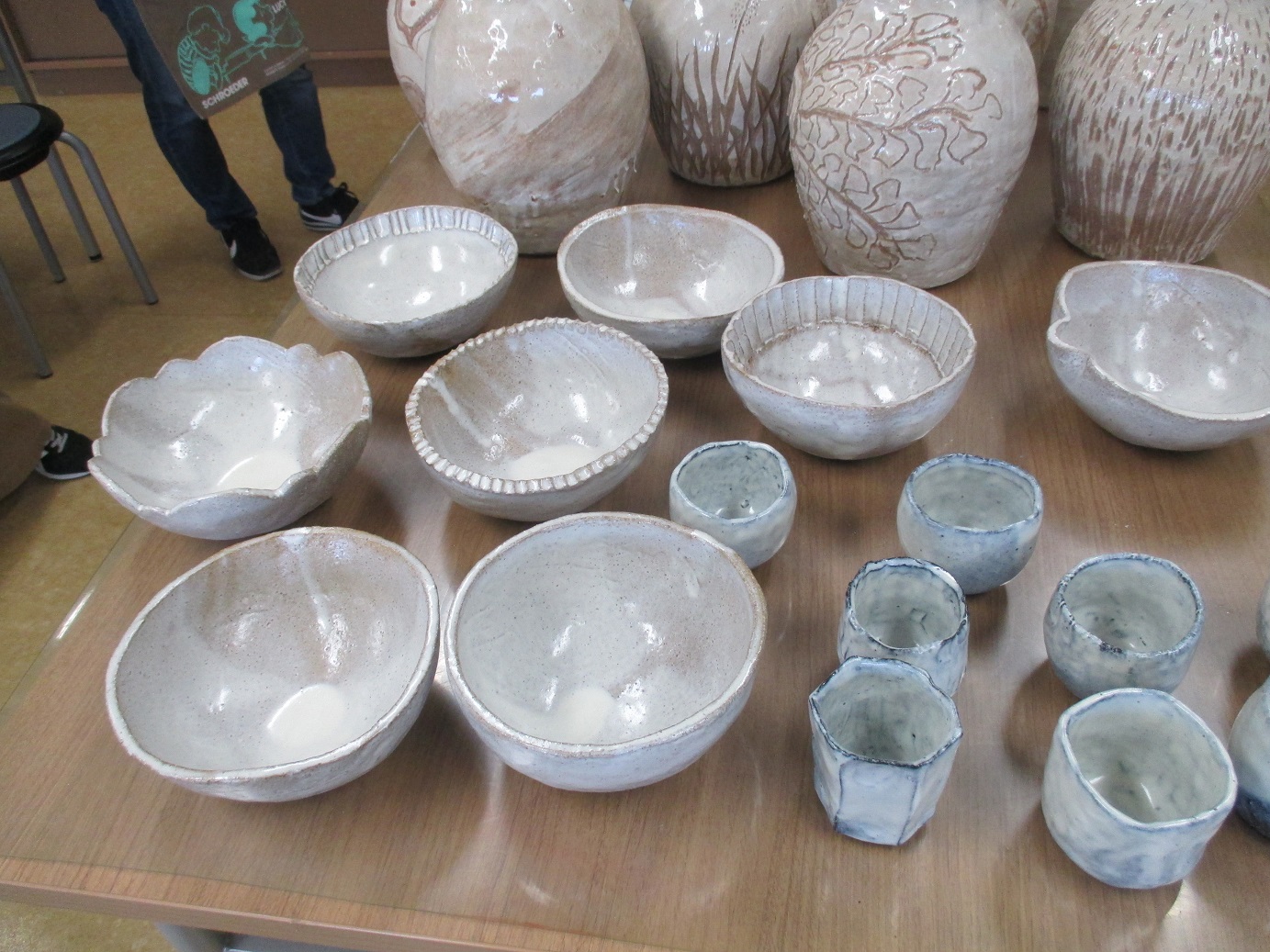 本焼きを済ませ、ドキドキしながら作品32点と対面いたしました。土の塊が2か月間の活動を経て、見事な作品に仕上がりました。コロナ禍での開催でしたが先生からご指導いただきながら、土と向き合った2か月間でした。早速、年末年始のお料理にという声も♪