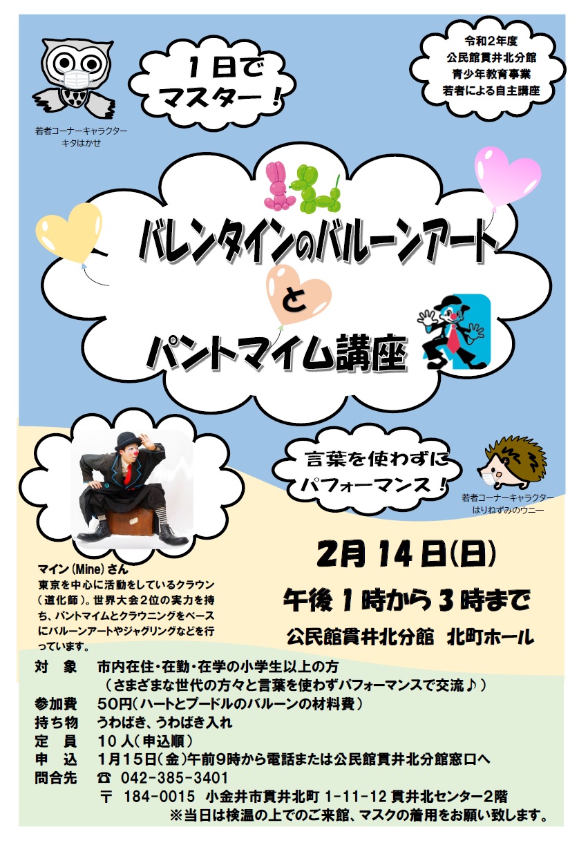 【満員御礼】2月14日(日)青少年教育事業 若者による自主講座「バレンタインのバルーンアートとパントマイム講座」は定員に達しましたの申込を締切ました。