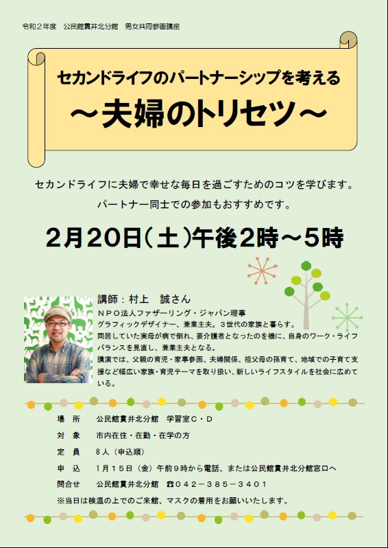 【募集中】2月20日(土)男女共同参画講座「セカンドライフのパートナーシップを考える~夫婦のトリセツ~」開催いたします。。