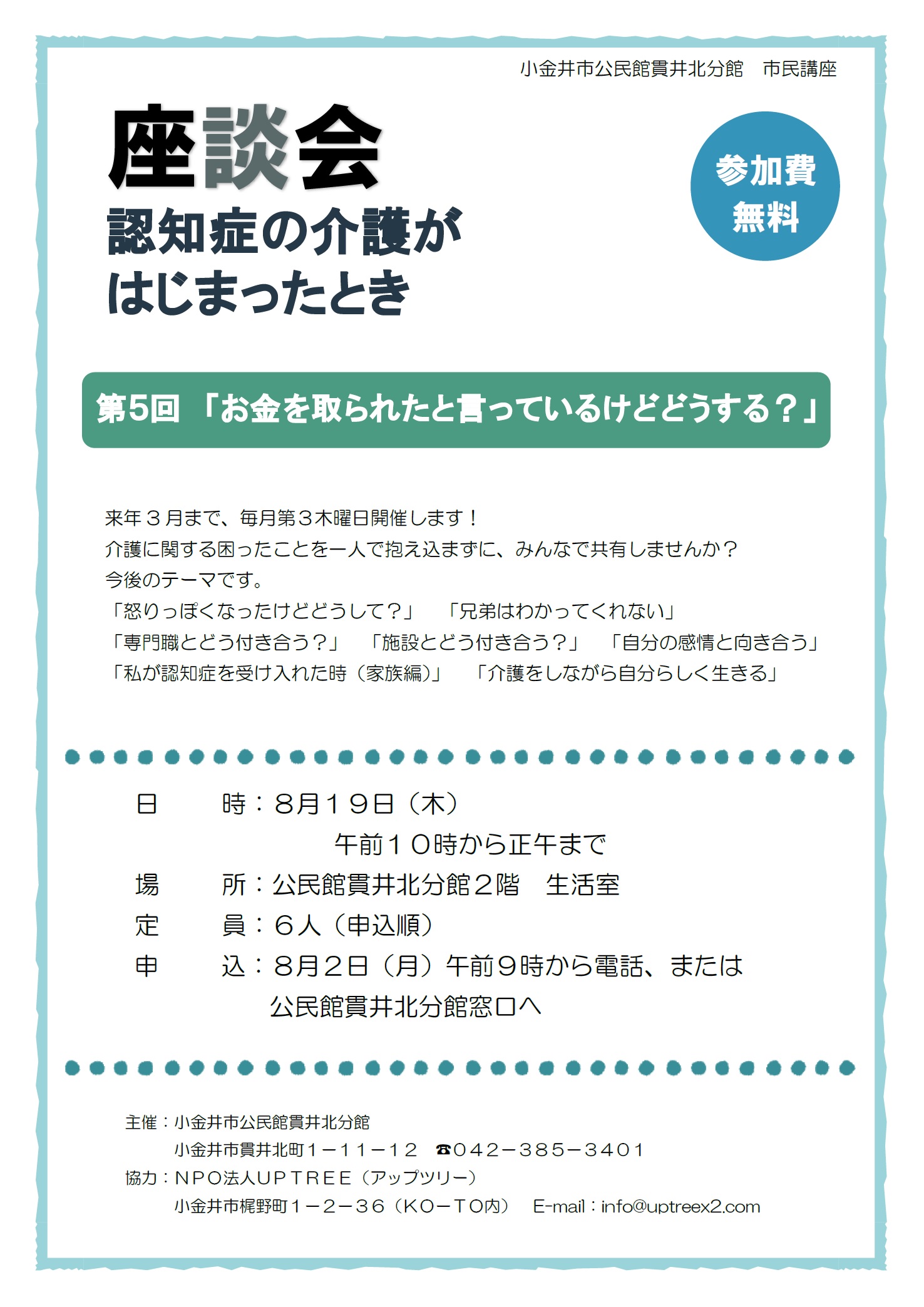 介護に関する困ったことを一人で抱え込まずに、みんなで共有しませんか?お申込みは8月2日(月)9時から、電話(