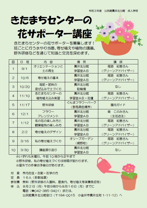 きたまちセンターの花サポーターを募集いたします。班ごとに行う水やり当番、寄せ植えうあ植物の講義、野外研修などを通じて知識と交流を深める講座です。電話(