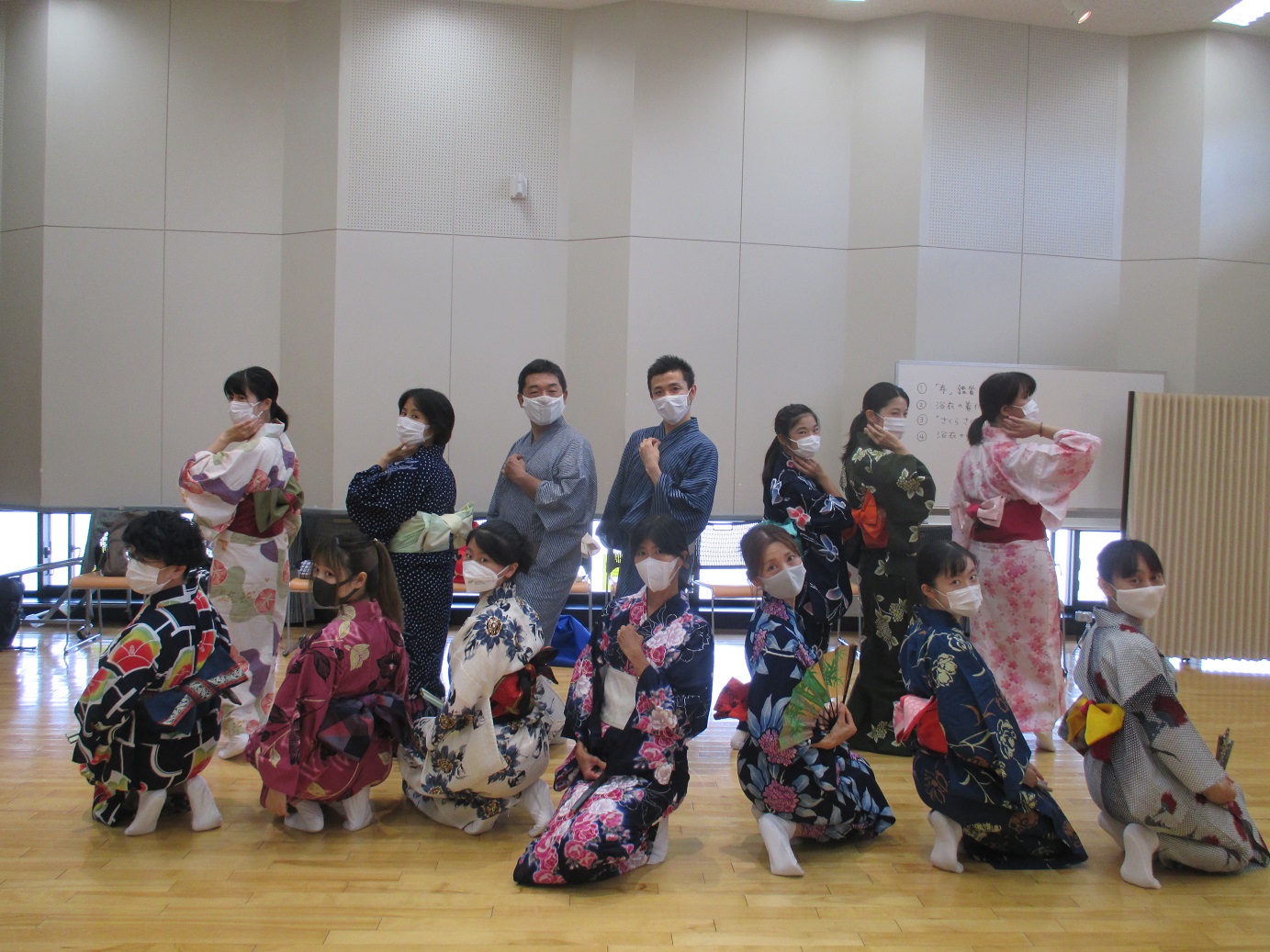 日本舞踊家を講師にお招きし、日本舞踊「市歌舞踊」「寿」鑑賞、大型ダンスミラーにご自身の姿を見ながら浴衣の着付け、さらに和装の所作体験に舞踊「さくらさくら」体験など、とても内容豊富な2日間でした。