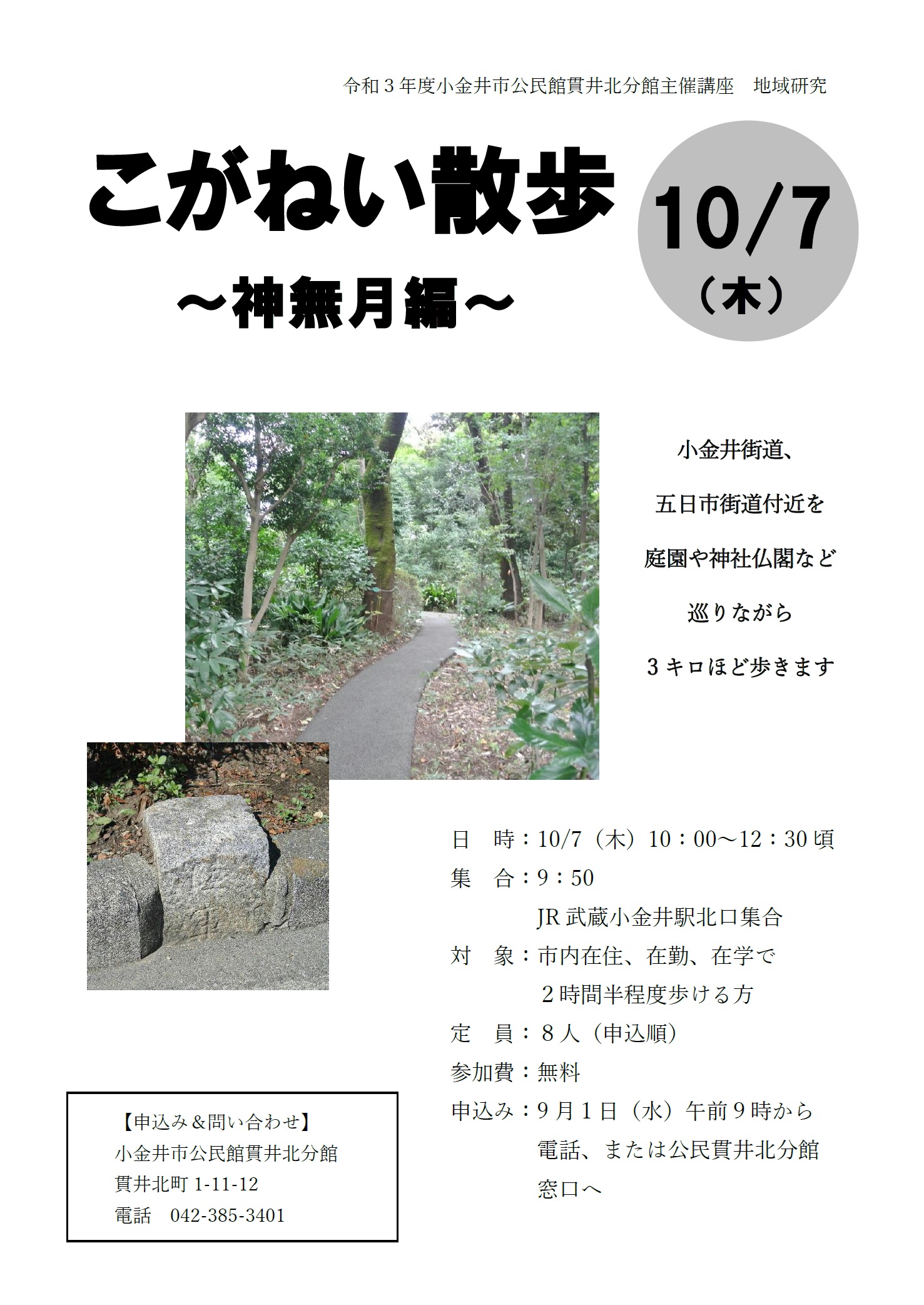 地域研究「こがねい散歩~神無月編~」9月1日午前9時から参加申し込み受付開始いたします。紅葉の始まる10月上旬、散歩にはとても気持ちのいい季節。参加者の皆さんと一緒に地域を歩き巡り、改めて小金井の道や自然、神社仏閣などの知識を深めてみませんか。