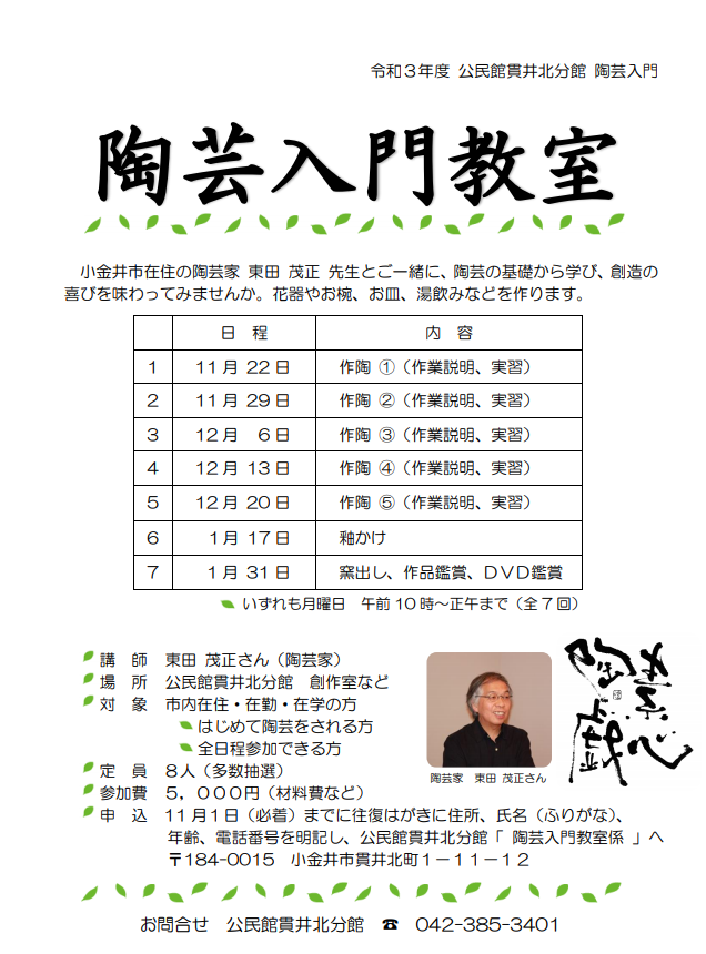 お申込みは、11月1日(必着)までに往復はがきに住所、氏名(ふりがな)、年齢、電話番号を明記し、公民館貫井北分館「陶芸入門教室係」へご応募ください。