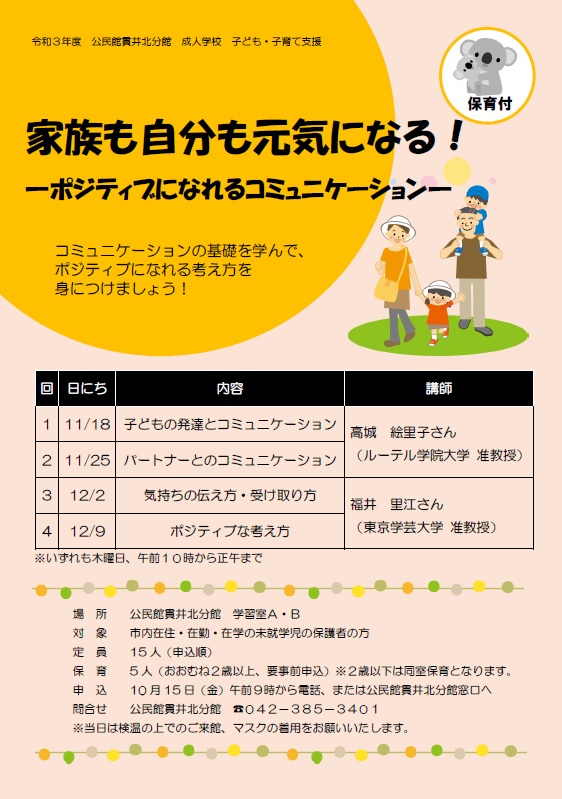 成人学校 子ども・子育て支援「家族も自分も元気になる!ーポジティブになれるコミュニケーションー」(保育付)開催いたします。