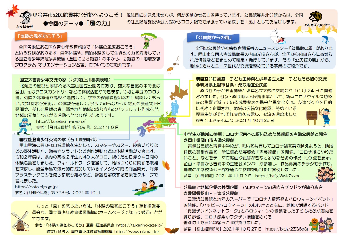 今回のテーマは花鳥風月シリーズの「風」。図書館からは「風はどこから吹いてくる?」関連の書籍の紹介、公民館からは「風の力」として全国各地の話題をお届けします