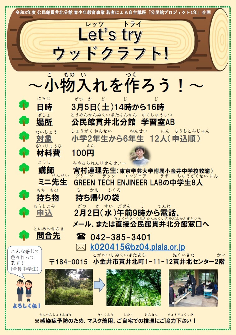 3月5日(土)開催「Let’s tryウッドクラフト ~小物入れを作ろう~」は定員となりました。現在、キャンセル待ちを受付中です。