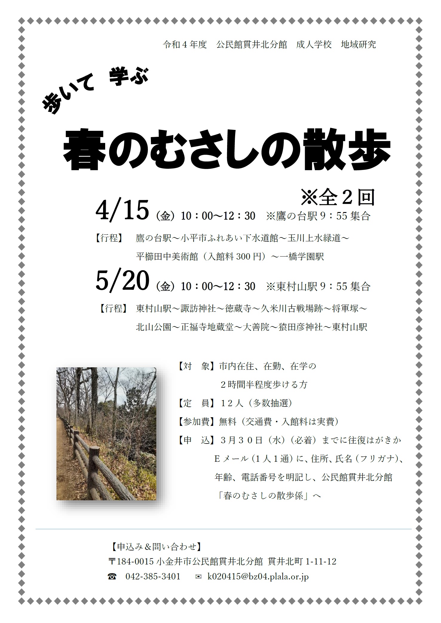 | きたまちセンター公民館貫井北分館 | 電話:042-385-3401 E-MAIL: k020415☆bz04.plala.or.jp |
